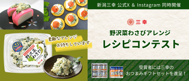 ハッシュタグ #三幸の野沢菜わさびアレンジ をつけて”写真+テキスト”で投稿